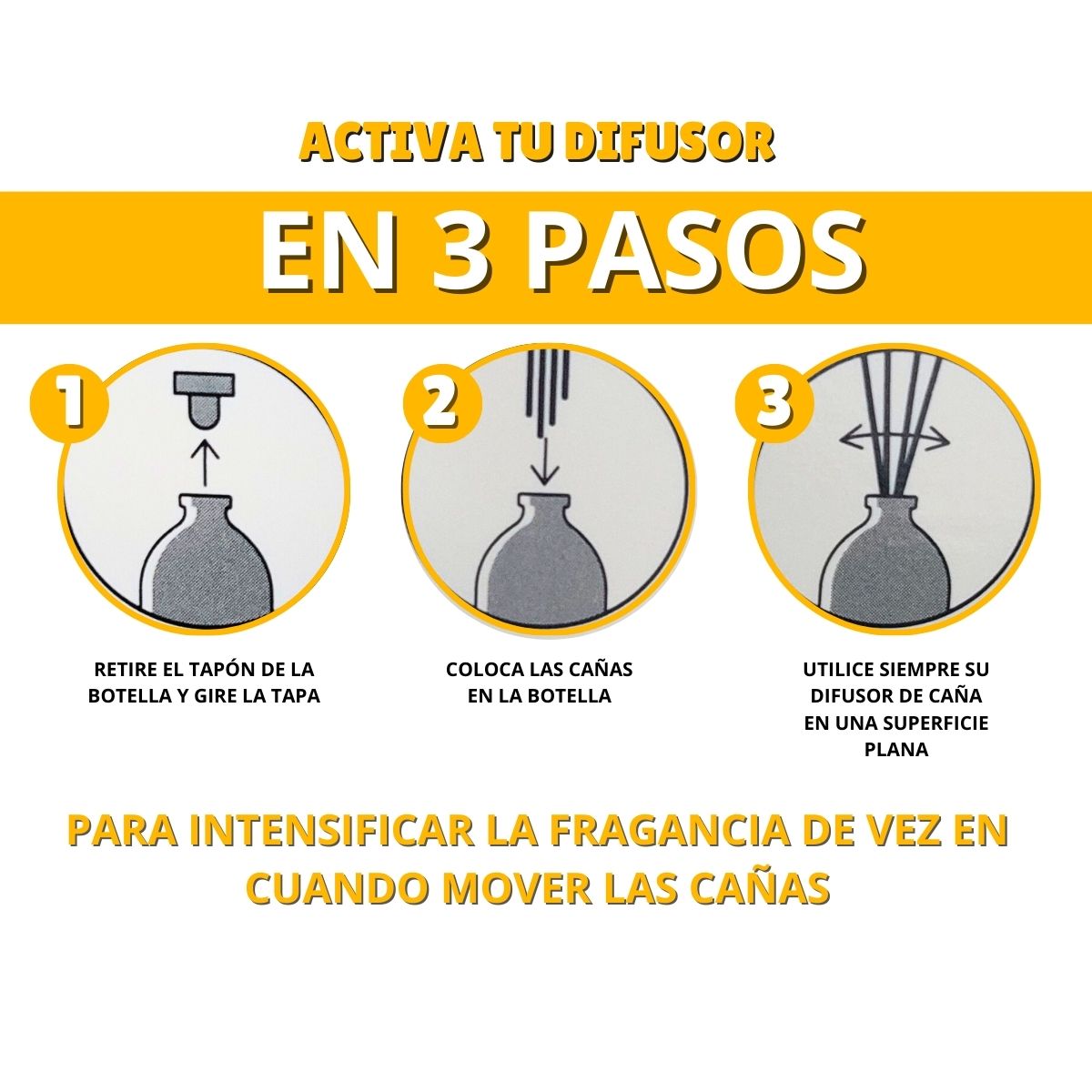 Gracias a la alta calidad de sus aceites aromáticos, este difusor libera su fragancia de manera constante y equilibrada durante semanas. Incluye 1 difusor y 6 varillas absorbentes, que permiten una difusión natural y sin necesidad de electricidad o fuego. Su uso es muy sencillo: solo colócalo sobre una superficie plana y estable, retira el tapón e introduce las varillas. Desde ese momento, el aroma se dispersará gradualmente.